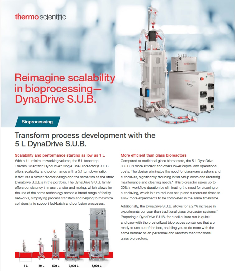 The Thermo Scientific DynaDrive 5L Single-Use Bioreactor is now available through Fisher Scientific. Redefine what scalability means for your process development.